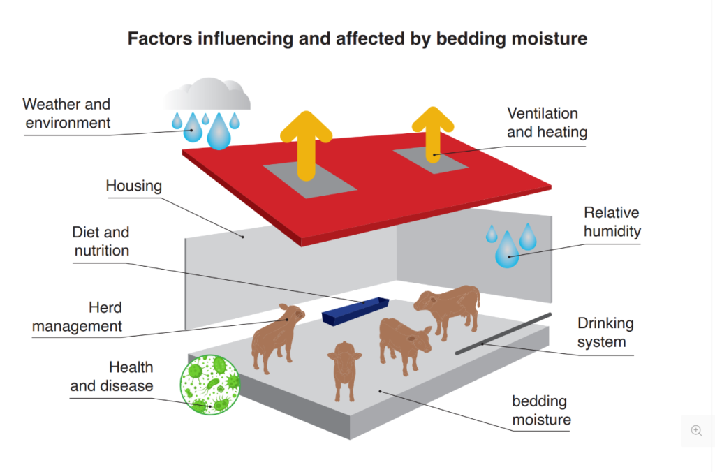 Flooring plays a critical role in this process by determining drainage and moisture retention. Impermeable surfaces such as solid concrete limit drainage and increase bedding wetness, whereas well-designed sloped or permeable floors help remove excess moisture and maintain drier conditions. Therefore, effective bedding management is particularly important where evaporation is limited and drainage is poor.